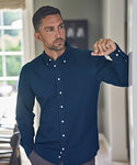 Shaped fit. Button-down collar. Fused collar and cuffs. Back yoke with box pleat. Inside hanger loop. Curved hem. Ascolite button wrapping.